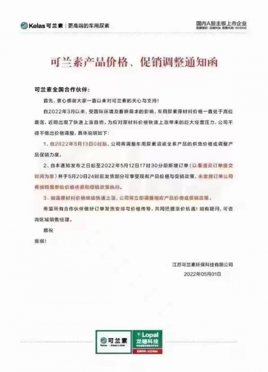 5月1日,江苏可兰素环保科技有限公司也发布了产品价格、促销调整通知函,指出自2022年3月以来,受国际环境及春耕需求的影响,车用尿素原材料价格一直处于高位震荡,近期出现了快速上涨趋势。为应对原材料价格快速上涨带来的巨大经营压力,公司不得不做出价格调整。据悉,5月12日国内尿素市场行情继续上调(幅度在30-160元/吨不等)。现主流地区出厂价格已破3300元/吨,局部市场价达到3420元/吨!高于去年高点200-300元/吨。