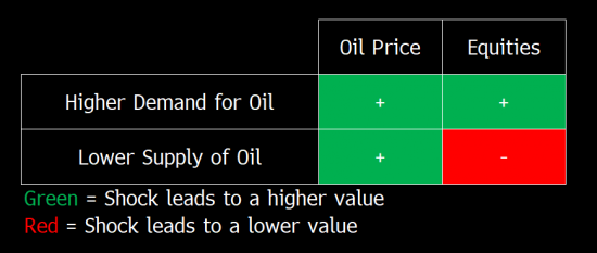如下表所示,如果油价和股市朝着同一方向(更高或更低)变动,则表明是需求引发的冲击。如果朝着相反的方向变动,则意味着是供应引发的冲击。