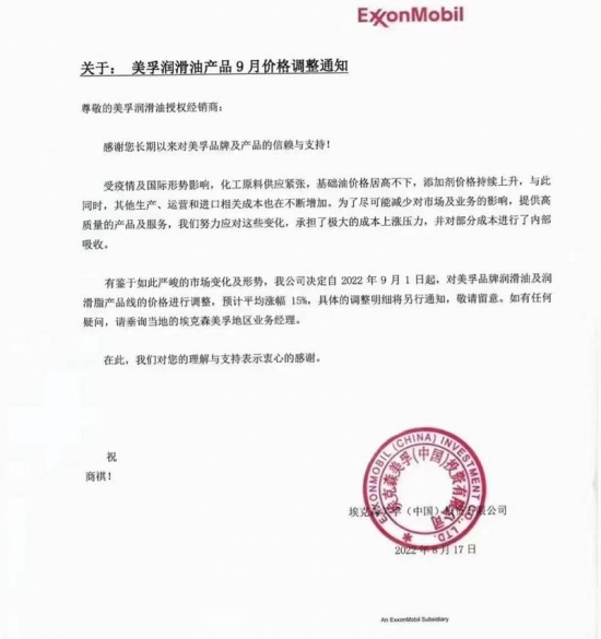 8月17日,埃克森美孚(中国)投资有限公司发布公告,自2022年9月1日起,美孚润滑油产品价格将做出调整,预计平均涨幅15%。全文如下: