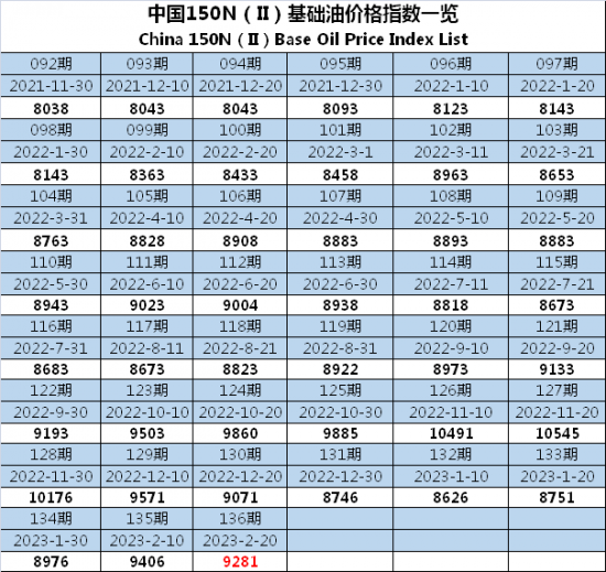 中国150N(Ⅱ)基础油价格指数第136期-涨势企稳下探