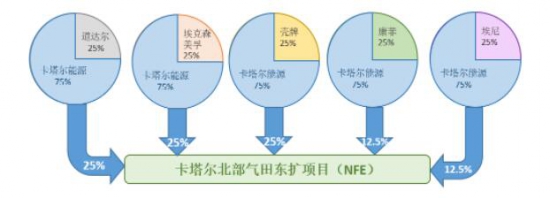 2022年6月,卡塔尔能源公司(QatarEnergy)相继与五大国际石油巨头签署了合作协议——道达尔能源、埃尼、康菲、埃克森美孚和壳牌,五大巨头通过分别与卡塔尔能源成立合资公司,合计持有东部项目25%的权益。
