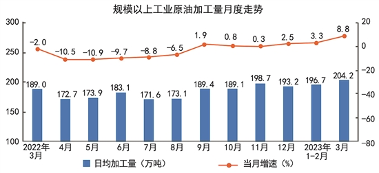 国家统计局数据显示,2023年3月份,全国原油加工量为6329万吨,同比增长8.8%,增速比1至2月份加快5.5个百分点,日均加工原油204.2万吨。